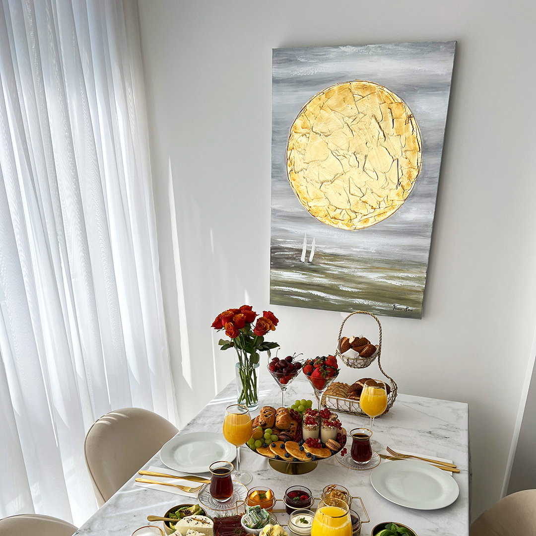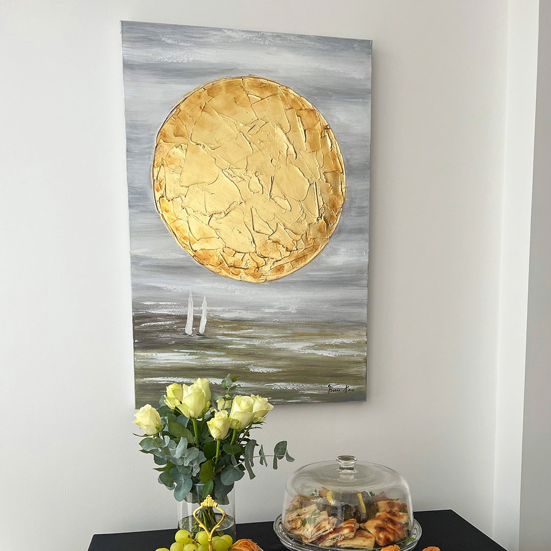 Na pintura acrílica pintada à mão 'Gold of the Dawn' pode sentir cada pincelada, para que a alta qualidade da obra de arte possa ser vista à primeira vista. As obras-primas selecionadas são assinadas pelos artistas.