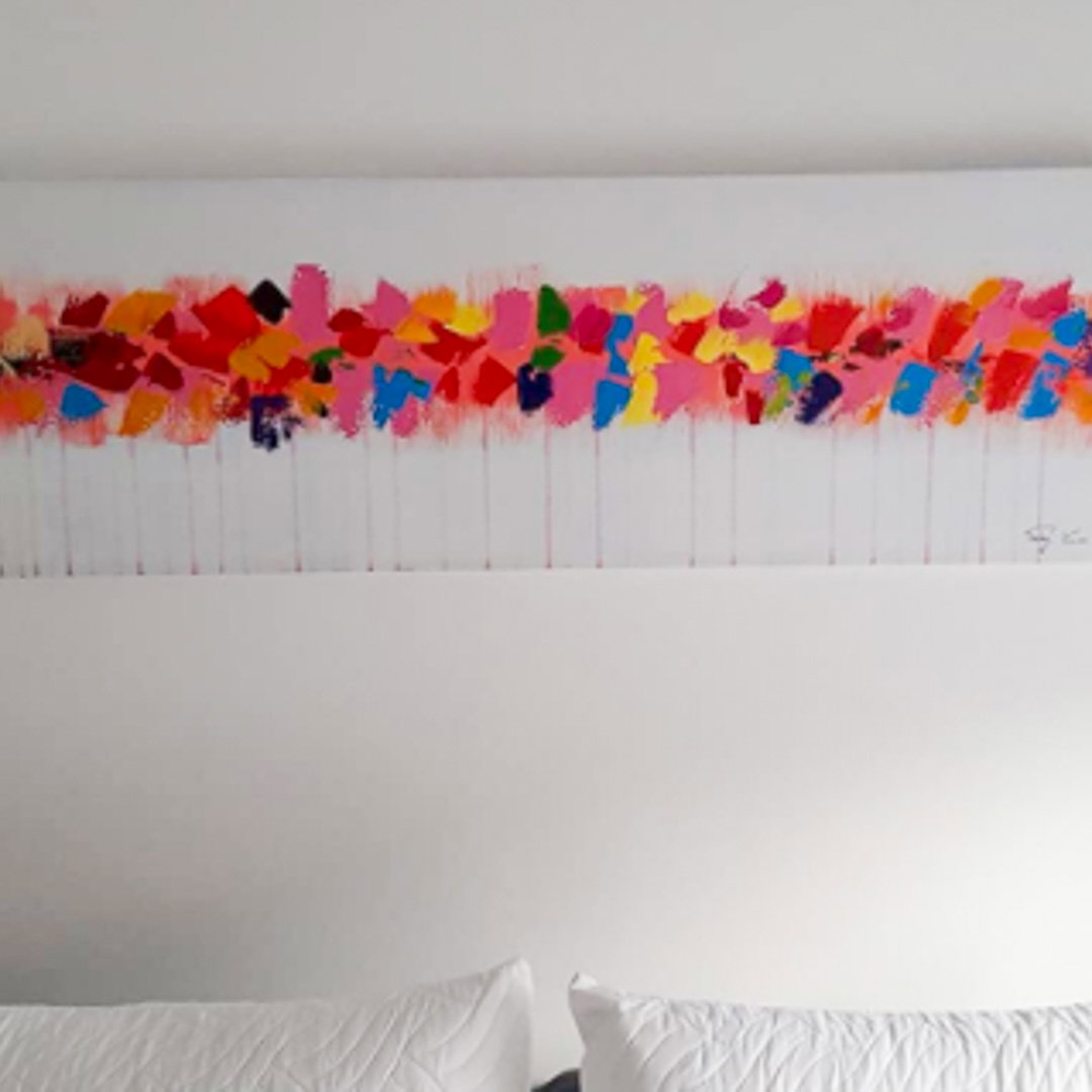 Os amantes da arte vão deliciar-se com a escolha de cores vibrantes do artista. Um sentimento de alegria surgirá em si e nos seus convidados ao ver 'Colour Play on the Horizon'. Uma explosão de cores de cortar a respiração encontra a sua perfeição no centro do quadro com um brilho dourado. O fundo bege subtil realça particularmente bem as cores vivas. Os pontos de cor que correm em direcção ao bordo inferior do quadro fazem com que as cores pareçam vivas. Mergulhe no seu mundo pessoal de cores todos os dias.
