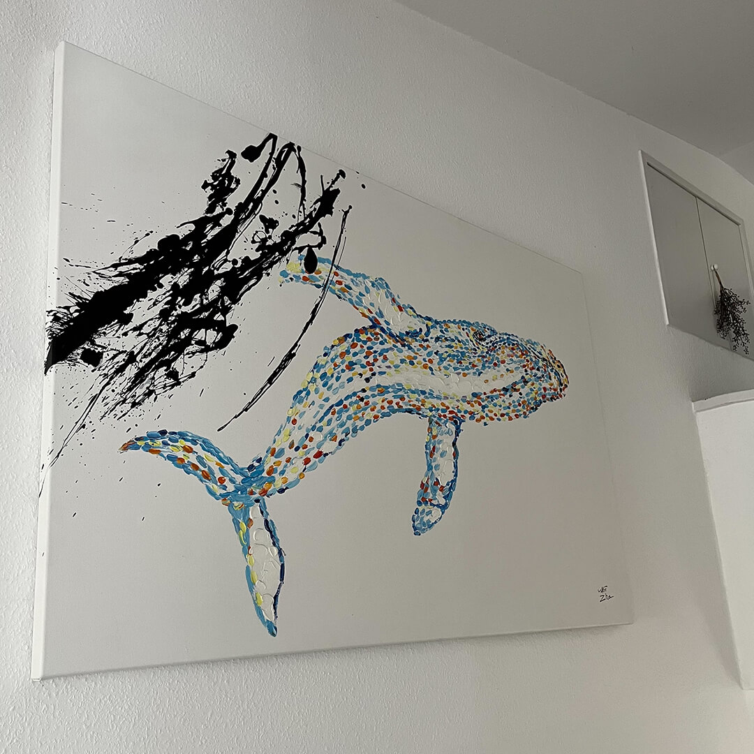 O 'Giant of the Pacific' cruza graciosamente o mar de grande formato na pintura a óleo do artista Victor Zhen. As nuances azuis e brancas correm sobre a superfície, que é rica em textura, iridificando-se umas nas outras e permitindo ao espectador mergulhar na vastidão do oceano. A criatura marinha pintada à mão simboliza poder e força nesta peça única.